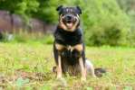 Красивая короткая плотная шерсть черного с рыжим зонарного окраса, по типу ротвейлера.
