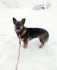 На улице приучается к поводку, пока не очень понимает, зачем человек на том конце поводка, и останавливается через какое-то время. Но старается.